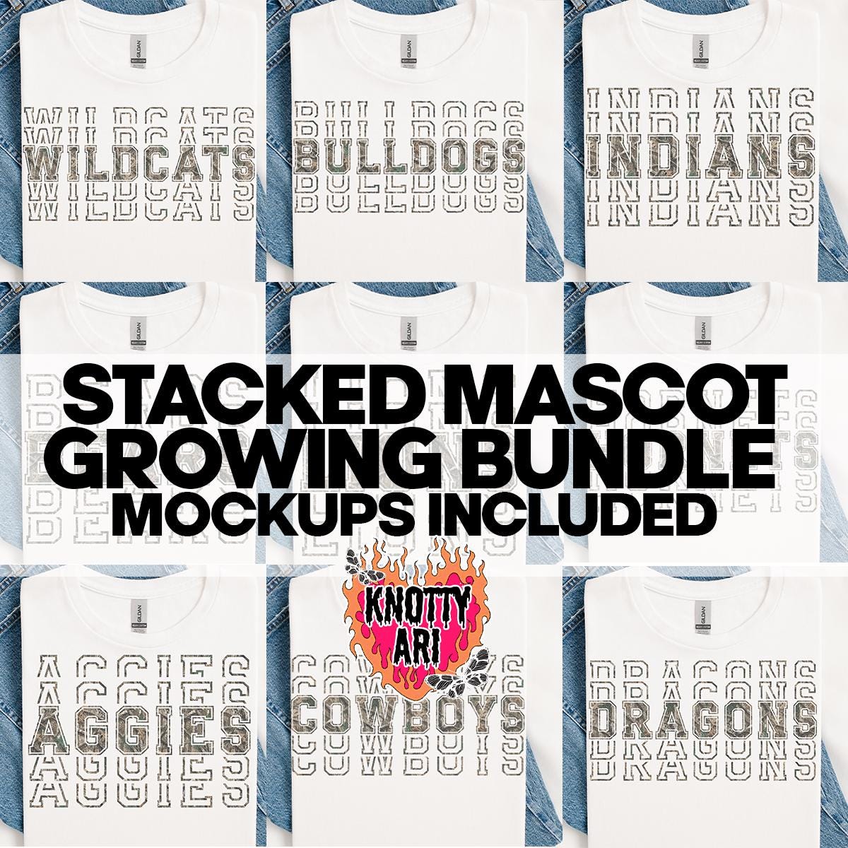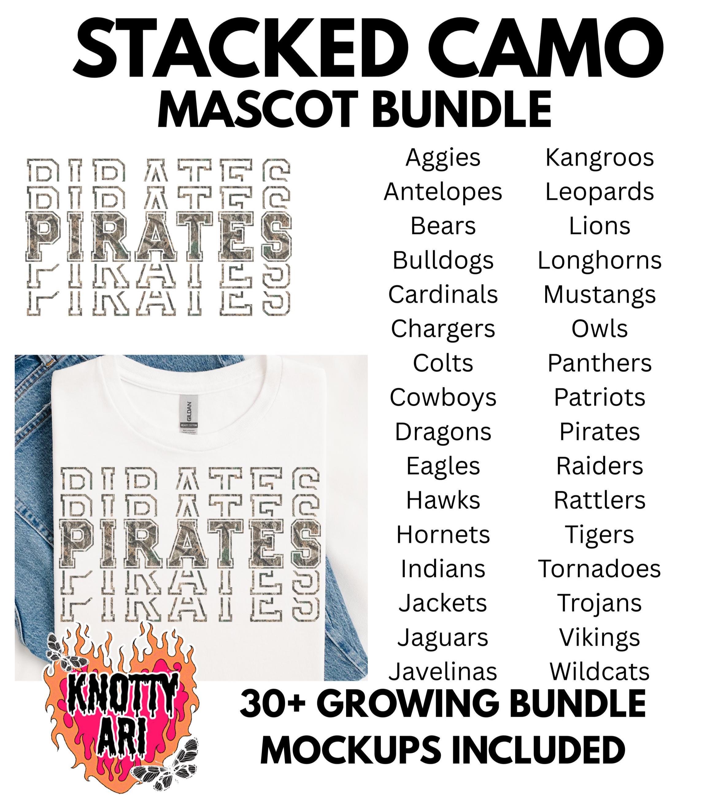 Bring bold school-spirit energy to your shop with this Stacked Camo Mascot Bundle!